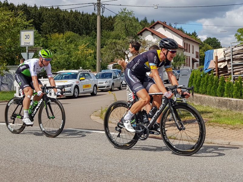 Da unsere Mannschaft sich die Etappen 2 und 3 vergangenes Wochenende angesehen hatte, wussten wir, dass es unwahrscheinlich sein würde, dass sich die Gruppe des Tages schnell löst. Die ersten 30 Kiometer führten nämlich auf der breiten B51 entlang. Danach ging es eine kurze steile Bergwertung hoch in Saarhölzbach. Zum Glück konnten sich dann doch 8 Fahrer vor der Bergwertung nach langer Springerei vom Feld lösen und etwa 1:45 Minuten herausfahren. Mit dabei von uns war Jan Hugger, der heute besonders motiviert war, da seine Freundin ihr Kommen angekündigt hat. Unten im Berg hatte ich noch gute Laune, dass jetzt hier entspannt gefahren wird bis zum Finale.